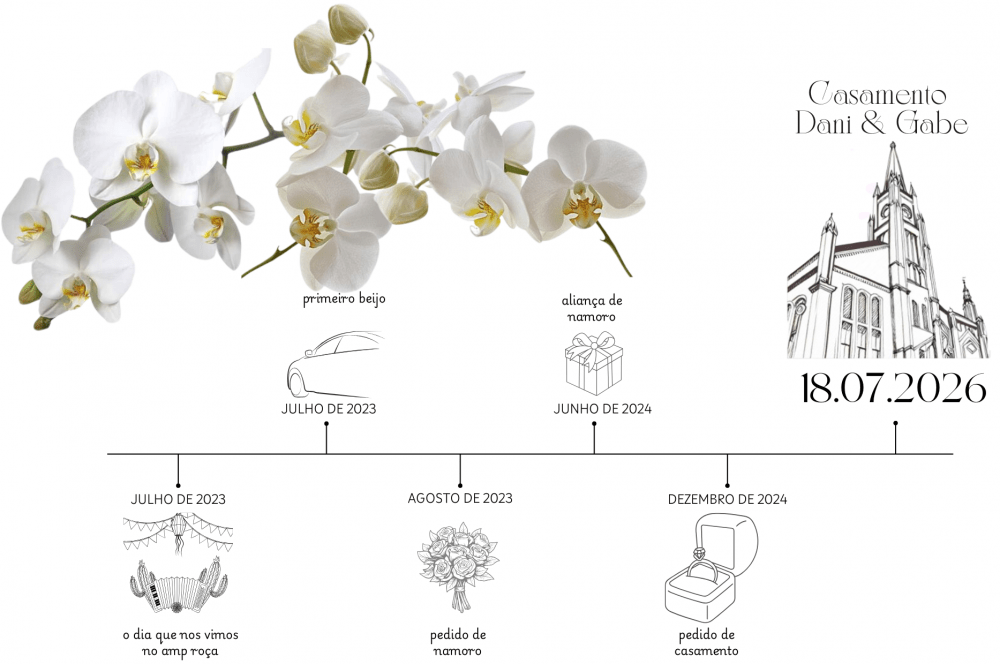 Gostaríamos muito de contar com a presença de todos vocês no momento em que nossa união será abençoada diante de Deus! Contamos com vocês! Dia 18 de julho de 2026, às 16h.